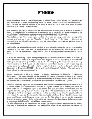 Este documento presenta una introducción al estudio de la filosofía y la lógica. Explica que existen diferentes tipos de conocimiento como el saber vulgar, el científico y el filosófico. Define la filosofía como una concepción racional y crítica del mundo basada en la razón más allá de lo observable. El texto organiza el curso en cuatro unidades que cubren nociones generales de filosofía, su base histórica, lógica y lenguaje, y lógica proposicional. El objetivo es desarrollar el