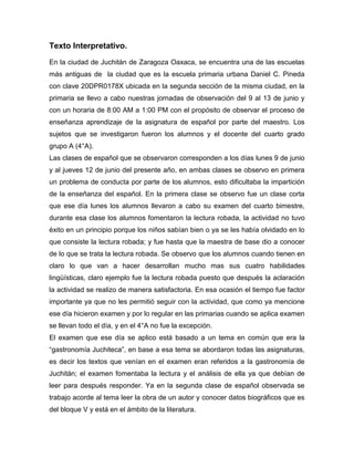 El documento describe las observaciones de clases de español en la primaria Daniel C. Pineda en Juchitán de Zaragoza, Oaxaca. Se observó que los estudiantes tenían problemas de conducta que dificultaban la enseñanza. En una clase, los estudiantes realizaron un examen sobre gastronomía de Juchitán y practicaron lectura en voz alta. En otra clase, los estudiantes aprendieron sobre autores de Juchitán y crearon biografías de uno de los autores. La escuela utiliza un enfoque inter