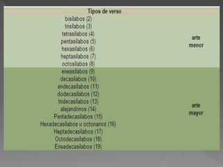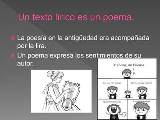El documento resume los elementos fundamentales de la poesía, incluyendo que tradicionalmente se acompañaba de la lira, que expresa los sentimientos del autor, y define conceptos como sinestesia y sujeto lírico. Explica que los poemas se componen de sílabas, versos y estrofas, y que existen reglas para medir el número de sílabas y clasificar los versos. También define la rima y sus diferentes tipos.