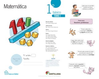 El documento presenta el Tomo I del material didáctico Matemática 1o básico del proyecto Casa del Saber de Editorial Santillana. El texto incluye 7 unidades organizadas en módulos y secciones que abordan contenidos matemáticos. El material fue creado por un equipo multidisciplinario y cuenta con evaluaciones iniciales, páginas de apoyo y evaluaciones finales.