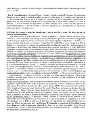 Este texto presenta el programa electoral del Frente Popular de cara a las elecciones de febrero de 1936, coalición de partidos de izquierda formada por republicanos, socialistas y comunistas. El programa propone la concesión de una amplia amnistía para los presos políticos, medidas de apoyo a campesinos y agricultores mediante reformas agrarias y fiscales, y el fomento de una enseñanza laica y accesible para todos los sectores de la sociedad.