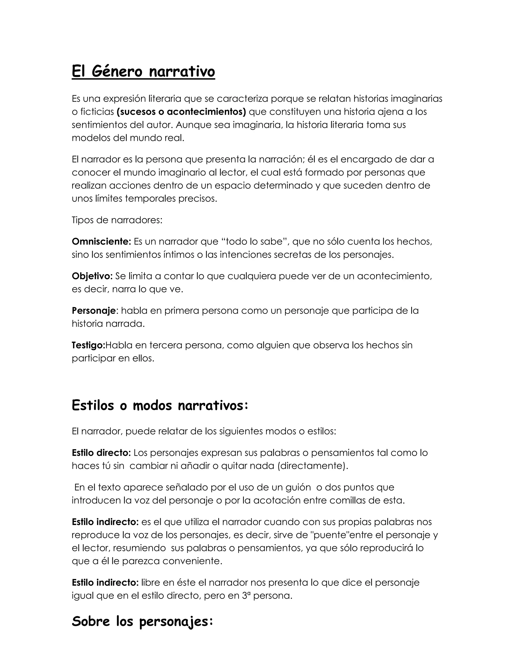 El documento describe los elementos fundamentales de la narrativa. Explica que la narrativa se caracteriza por relatar historias ficticias o imaginarias contadas por un narrador. Describe los diferentes tipos de narradores y estilos narrativos, así como los conceptos de personajes, tiempo y espacio en una narrativa. Además, define conceptos clave como el protagonista, antagonista, tiempo de la historia vs tiempo del relato, y el uso de técnicas como flashbacks.