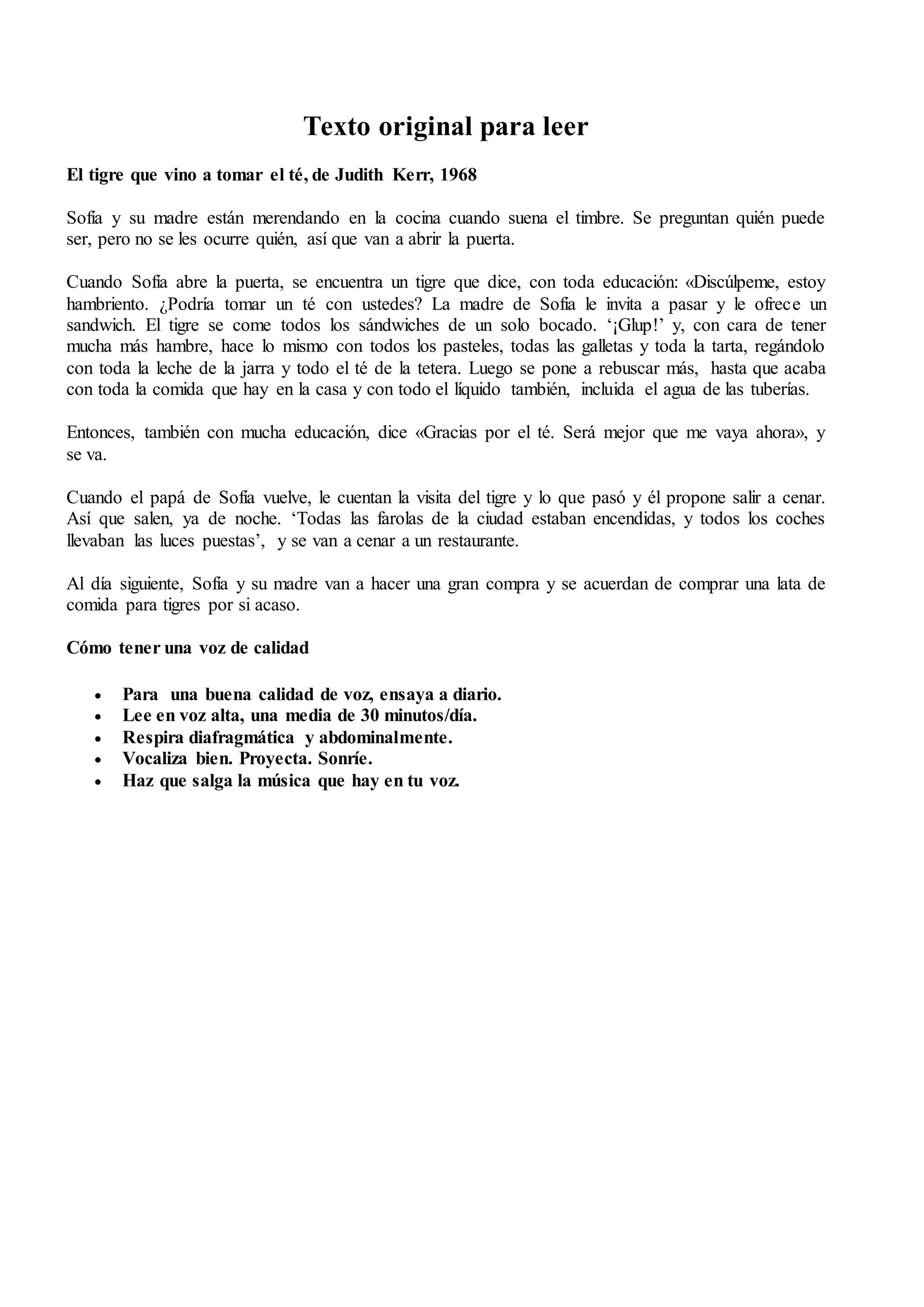 El documento presenta un resumen de la historia "El tigre que vino a tomar el té" de Judith Kerr. Cuenta que Sofía y su madre están tomando el té cuando un tigre educadamente pide si puede unirse a ellas. El tigre se come toda la comida y bebida en la casa antes de irse educadamente. Más tarde, la familia sale a cenar a un restaurante y Sofía y su madre compran comida para tigres por si vuelve.