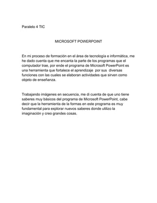 El documento habla sobre el programa Microsoft PowerPoint y cómo ha ayudado al autor en su formación en tecnología e informática. PowerPoint es una herramienta que fortalece el aprendizaje a través de sus diversas funciones, que permiten crear actividades para la enseñanza. Trabajando con imágenes en secuencia, el autor se dio cuenta que tiene conocimientos básicos del programa, y que la herramienta de formas es fundamental para explorar nuevos saberes y crear cosas con la imaginación.