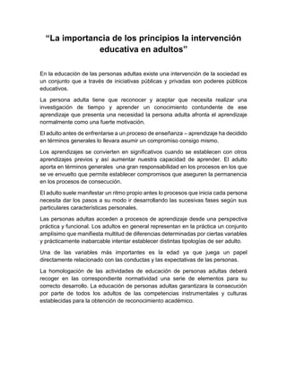 El documento discute los principios de la intervención educativa en adultos. Explica que la educación de adultos es importante para que las personas adquieran nuevos conocimientos y habilidades a lo largo de su vida. También señala que la educación de adultos debe reconocer que los adultos aprenden de manera diferente que los niños, a un ritmo propio y desde una perspectiva práctica. Además, la educación de adultos debe ser accesible a todas las personas sin discriminación.