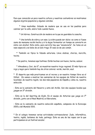 El documento presenta un colegio en Avilés, España. Se introduce al profesorado y alumnado del colegio y se describe la localización y características del colegio. Se muestran aspectos culturales de Asturias como la sidra, la fabada asturiana y el traje regional. Finalmente, los alumnos responden preguntas sobre sus gustos, actividades y asignaturas favoritas.