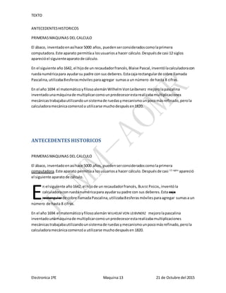 El ábaco fue la primera computadora hace 5000 años. En 1642, Blaise Pascal inventó la calculadora con rueda numérica para ayudar a su padre. En 1694, Wilhelm Von Leibvnerz mejoró la máquina de Pascal inventando una máquina de multiplicar que realizaba cálculos mecánicos usando ruedas y mecanismos.