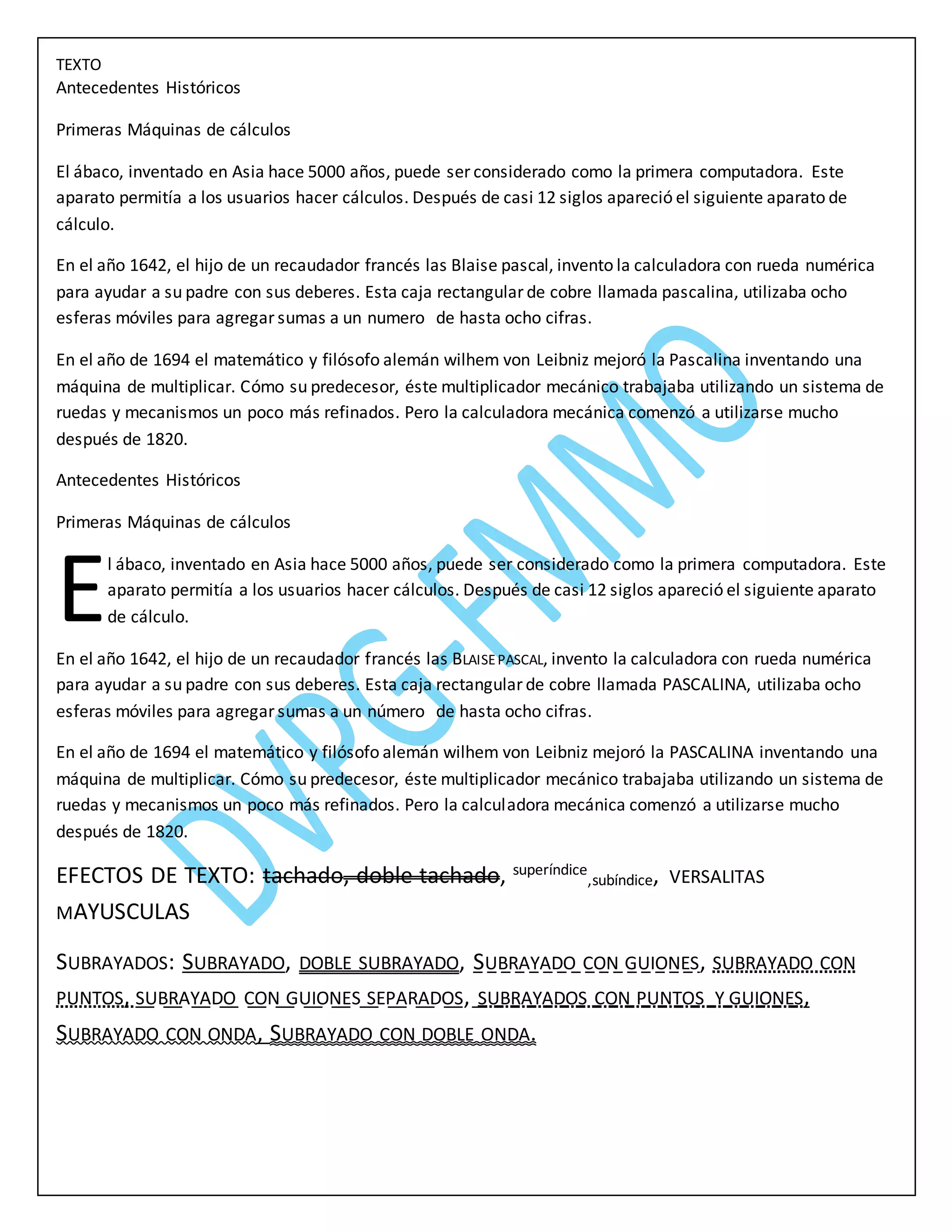 El documento describe la historia de las primeras máquinas de cálculo. El ábaco, inventado hace 5000 años en Asia, fue la primera computadora y permitía realizar cálculos. En 1642, Blaise Pascal inventó la calculadora con rueda numérica para ayudar a su padre. Esta máquina llamada Pascalina utilizaba esferas móviles para sumar números de hasta ocho cifras. En 1694, Wilhelm von Leibniz mejoró la Pascalina al inventar una máquina de multiplicar basada en ruedas y mecanismos.