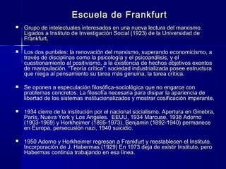 Este documento resume los conceptos clave de la Escuela de Frankfurt, incluyendo sus fundadores como Theodor Adorno, Max Horkheimer y Walter Benjamin. La Escuela de Frankfurt se centró en una nueva lectura crítica del marxismo y el cuestionamiento del positivismo. Analizaron cómo la razón instrumental había dejado de lado su potencial emancipador y en su lugar promovía la cosificación, uniformidad e irracionalidad en la sociedad. Conceptos como la "industria cultural" describen cómo la cultura de masas era producida industrialmente para reproducir la racionalidad