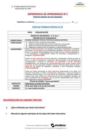 Este documento presenta una guía para que los estudiantes elaboren un texto instructivo sobre recomendaciones para cuidar la salud emocional. Incluye instrucciones para identificar trastornos emocionales comunes, elegir un destinatario, y escribir las recomendaciones usando verbos en el modo imperativo u otros elementos propios del género instructivo. El objetivo es que los estudiantes aprendan a elaborar este tipo de texto y transmitan consejos sobre bienestar emocional.