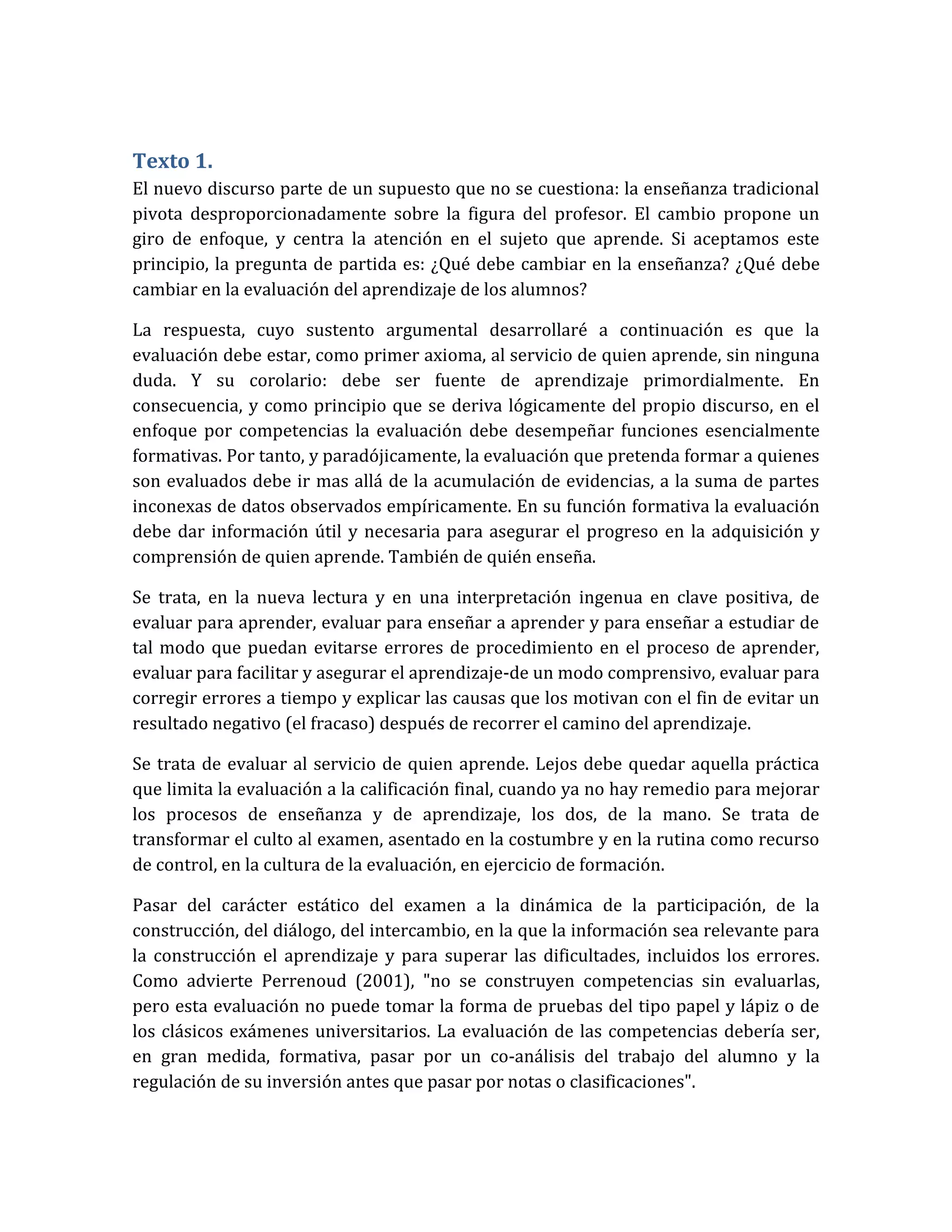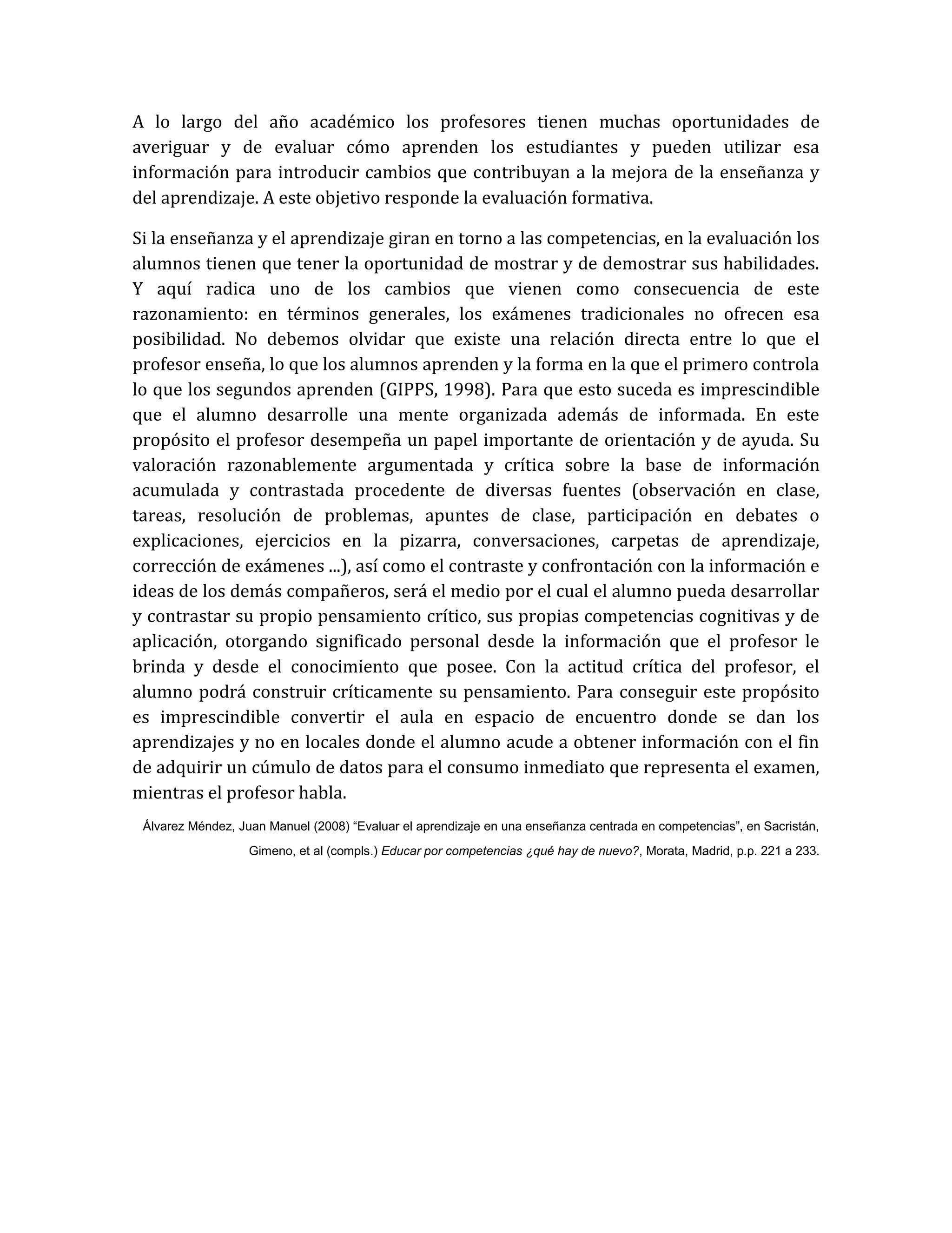 El documento discute la evaluación formativa centrada en el estudiante. Argumenta que la evaluación debe servir principalmente para facilitar el aprendizaje del estudiante y proveer información útil para asegurar su progreso. También debe ser una fuente de aprendizaje para el estudiante y el profesor. La evaluación debe ir más allá de la acumulación de datos aislados y proveer información que guíe la enseñanza y el aprendizaje.