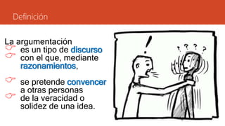 Este documento define la argumentación y describe su estructura y tipos. La argumentación es un discurso que intenta convencer a otros de una idea mediante razonamientos. Se organiza en tres partes: tesis, cuerpo y conclusión. El cuerpo presenta argumentos que apoyan la tesis. Existen argumentos deductivos e inductivos, de apoyo o contraargumentos, y textos argumentativos científicos o subjetivos.