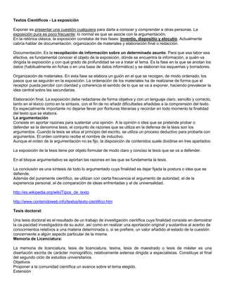 Este documento describe tres tipos principales de textos: científicos, jurídicos y administrativos. Explica que los textos científicos se producen en el contexto de la investigación científica y presentan avances de investigación a través de géneros como tesis doctorales, memorias de licenciatura, artículos científicos y monografías. Los textos jurídicos se producen en el proceso de administración de justicia y tienen una estructura y terminología formal como las sentencias. Los textos administrativos se refieren