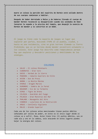 Este documento resume la trama del videojuego Shadow of the Colossus. El juego sigue a Wander, un guerrero que hace un trato con Dormin para revivir a su amada Mono. Para lograrlo, Wander debe derrotar a 16 colosos gigantes que actúan como prisión para las partes del alma de Dormin. Después de derrotar a todos los colosos, Wander revive a Mono pero se transforma en Dormin, aunque eventualmente Lord Emon detiene la transformación.