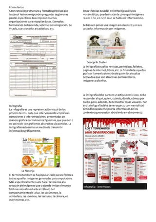 Este documento describe diferentes tipos de textos discontinuos como gráficas, cuadros, tablas, diagramas, formularios, infografías y mapas conceptuales. Explica que estos textos se caracterizan por no tener una lectura lineal y presentan la información de manera gráfica y no lineal. Luego, define y da ejemplos de cada uno de estos tipos de textos discontinuos.