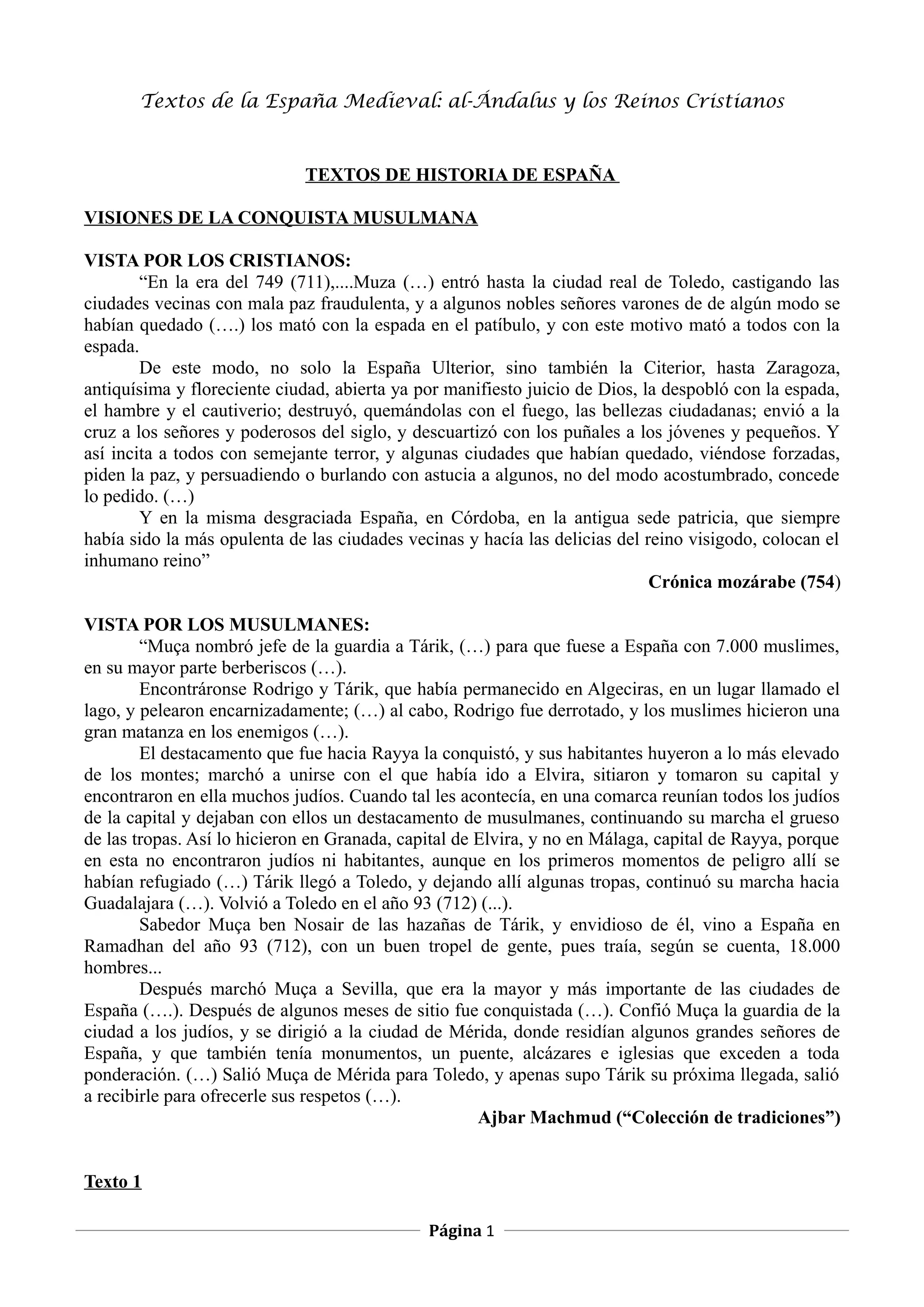 1) Una crónica cristiana describe la conquista musulmana como una invasión violenta que destruyó ciudades y mató a muchos, mientras que una fuente musulmana la describe como victorias militares sobre el rey visigodo Rodrigo.