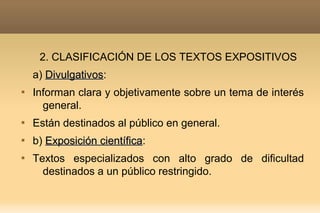 Este documento describe los textos expositivos, que tienen la intención de informar de forma clara y ordenada sobre un tema. Se dividen en divulgativos, destinados al público general, y científicos, más especializados. Tienen una estructura común de introducción, desarrollo y conclusión. El desarrollo puede ser analizante, sintetizante o encuadrado. Utilizan recursos lingüísticos como oraciones enunciativas y conectores para transmitir la información de manera objetiva y sin ambigüedades.