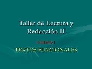 Este documento describe los textos funcionales, sus propósitos y elementos. Explica que los textos funcionales son herramientas para la vida diaria como currículums, cartas y solicitudes, y que cumplen funciones de informar, convencer o solicitar. Describe las funciones referencial e informativa para informar sobre ideas y objetos, y la función apelativa para convencer u ordenar. También explica los elementos comunes de una carta como membrete, fecha, dirección, saludo, texto, despedida y firma.