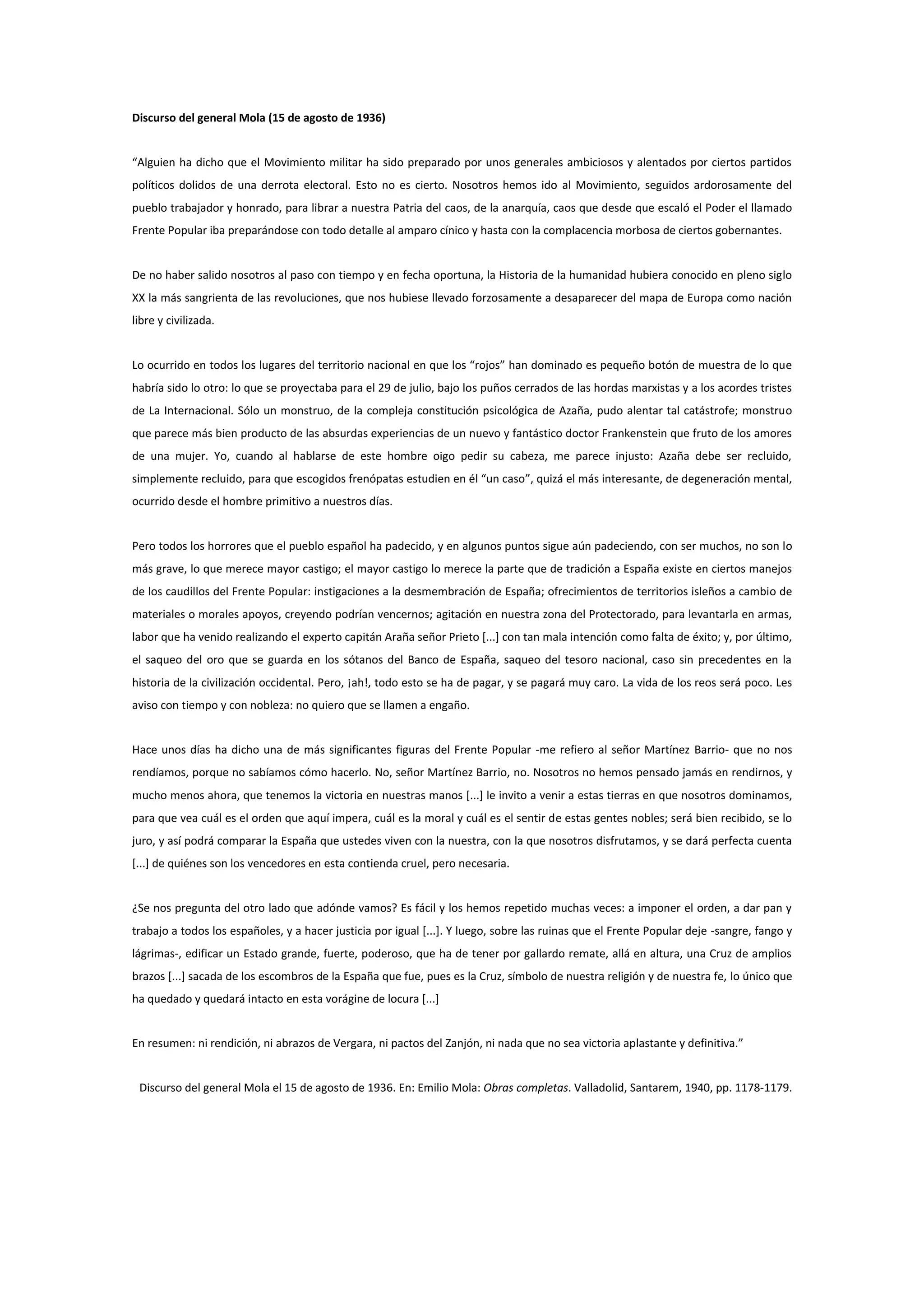 El general Mola defiende el levantamiento militar del 18 de julio de 1936 argumentando que evitó una revolución comunista más sangrienta y llevó orden a España, asegurando la victoria del bando sublevado. También critica duramente a los líderes del Frente Popular, a los que acusa de traición a España. Mola rechaza cualquier posibilidad de rendición y promete imponer su victoria definitiva.