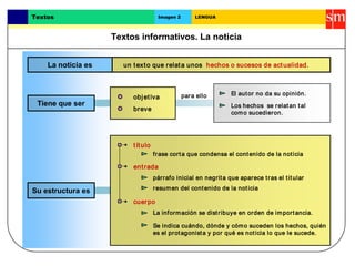 Este documento describe diferentes tipos de textos informativos y sus características. Los textos informativos deben ser objetivos, claros y precisos. Incluyen datos concretos sin opiniones personales del autor. Su estructura generalmente incluye título, entrada, cuerpo y resumen. Dentro de los textos informativos se describen la noticia, el reportaje, la crónica y el artículo divulgativo.
