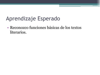 Este documento presenta información sobre textos literarios. Define la literatura como una unidad de comunicación cuya característica más importante es la ficción. Explica las funciones estética, cognoscitiva, socio-ideológica y educativo-moral de los textos literarios. También describe los géneros narrativo, lírico y dramático, incluyendo sus propósitos, características y elementos.
