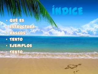 Este documento describe los textos instructivos, su estructura y rasgos. Explica que tienen el propósito de orientar de forma detallada, clara y precisa para realizar alguna actividad. Su estructura incluye introducción, desarrollo y desenlace. Utilizan conectores de tiempo, verbos en infinitivo e imperativo y lenguaje directo. Incluye ejemplos como recetas de cocina y bases de concursos.