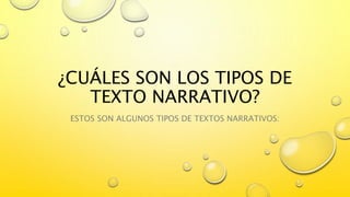 Este documento describe los diferentes elementos que componen un texto narrativo. Explica que un texto narrativo cuenta una historia real o ficticia a través de una sucesión de hechos involucrando personajes. Luego, detalla varios tipos de textos narrativos como cuentos, novelas, crónicas y biografías. Finalmente, analiza los elementos clave de un cuento como los personajes, el narrador, el ambiente y el tiempo en que se desarrolla la historia.
