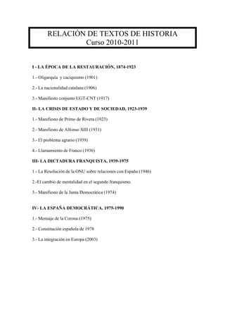 Este documento presenta 7 textos relacionados con la historia de España desde la Restauración hasta la democracia. El primer texto trata sobre la oligarquía y el caciquismo durante la Restauración. El segundo habla sobre la nacionalidad catalana. El tercero presenta el manifiesto conjunto de UGT-CNT de 1917. Los textos 4, 5 y 6 presentan respectivamente el manifiesto de Primo de Rivera tras el golpe de 1923, el manifiesto de Alfonso XIII de 1931 y el problema agrario durante la República. Finalmente, el