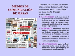 Este documento describe los diferentes tipos de textos periodísticos, sus funciones y características. Explica que los medios de comunicación de masas cumplen tres funciones principales: informar, formar opinión e entretener. A continuación, detalla los diferentes géneros periodísticos como la noticia, el reportaje, la entrevista, el artículo y la crítica, y describe sus rasgos lingüísticos y estructurales.