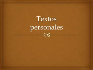 Este documento describe los textos personales, que narran y describen experiencias e ideas íntimas del autor. Estos textos incluyen diarios, memorias, cartas y otros formatos. Sus funciones principales son expresar emociones, influir en el lector y compartir información. Generalmente tienen un esquema y organización variable, reflejan la subjetividad del autor y usan un léxico y sintaxis más coloquiales.