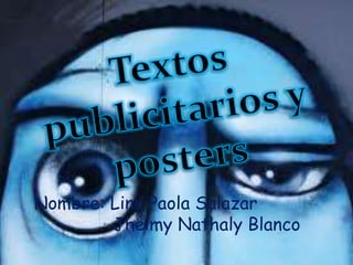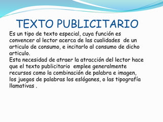 El documento habla sobre los textos publicitarios. Explica que su función es convencer al lector sobre las cualidades de un producto para consumo e incitar su compra. Para lograr esto, los textos publicitarios suelen usar recursos como la combinación de palabras e imágenes, juegos de palabras, eslóganes y tipografías llamativas. También describen la finalidad de los textos publicitarios como la persuasión a través de signos como palabras, sonidos e imágenes que mezclan información sobre las características del producto y asocian el product