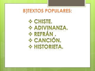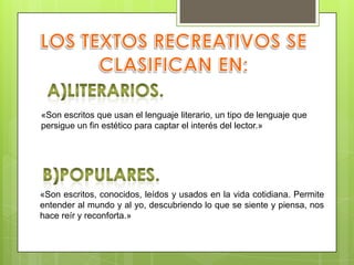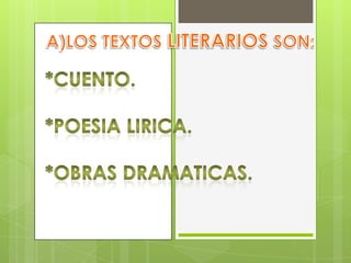 El documento habla sobre diferentes géneros literarios y sus características internas y externas. Brevemente describe las novelas como relatos ficticios con personajes y situaciones, la poesía como una expresión de sentimientos en verso, y los cuentos como historias breves en prosa que pueden ser reales o imaginarias.