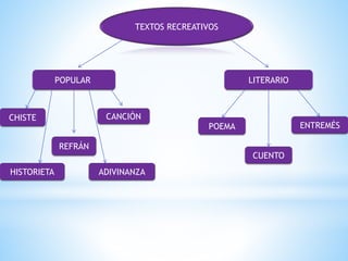 Este documento describe diferentes tipos de textos recreativos, incluyendo literarios como el entremés, la novela y el cuento, así como populares como el refrán, la historieta, el chiste, la adivinanza y la canción. Explica las características internas y externas de cada uno, señalando que su propósito es deleitar y entretener al lector.