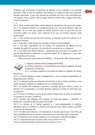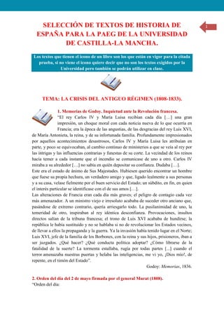 1) El documento presenta varios textos históricos relacionados con la crisis del Antiguo Régimen en España entre 1808 y 1833, incluyendo extractos de las memorias de Manuel Godoy sobre la Revolución Francesa, la orden del día del general Murat tras el levantamiento del 2 de mayo de 1808 en Madrid, y varios artículos de la Constitución de 1812.