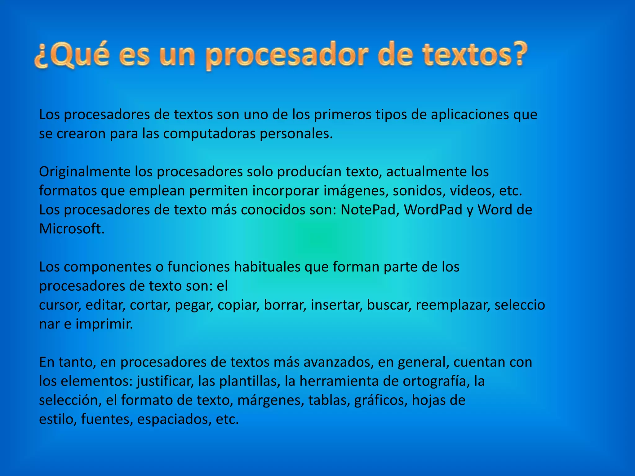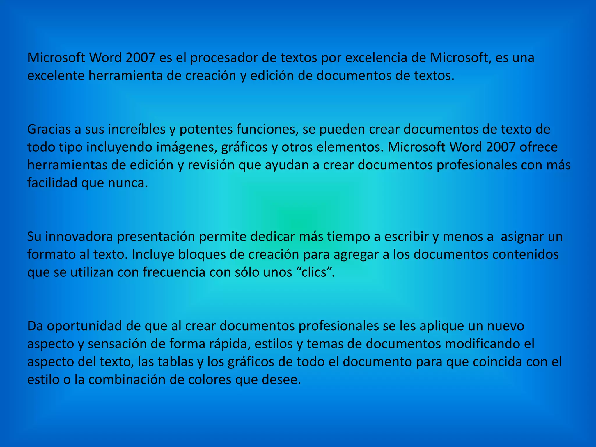 El documento proporciona información sobre los procesadores de texto, incluyendo sus orígenes, funciones principales y algunos de los procesadores más conocidos como Microsoft Word. Explica las herramientas básicas de edición de texto y las características avanzadas disponibles en procesadores modernos. También describe las funciones y componentes clave de Microsoft Word 2007.