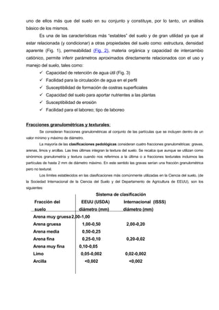 El documento describe los métodos para determinar la textura del suelo, incluyendo la determinación cualitativa en campo y cuantitativa en laboratorio. La textura se refiere a las proporciones de arena, limo y arcilla en el suelo y afecta propiedades como la estructura, permeabilidad y retención de agua. Los métodos de laboratorio más comunes se basan en la sedimentación de las partículas de suelo en función de su tamaño y velocidad de caída según la ley de Stokes.