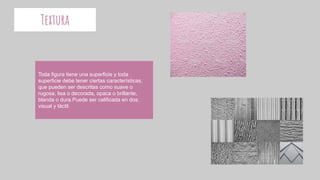 Este documento describe diferentes tipos de texturas, incluyendo texturas visuales, decorativas, espontáneas y mecánicas. También describe texturas táctiles naturales, modificadas y organizadas. Además, clasifica las texturas en naturales, artificiales, geométricas y orgánicas. Por último, define el espacio y cómo afecta la percepción visual, y cómo las texturas pueden combinarse en el espacio a través de motivos y repeticiones como en estampados de madera, piedra y pavimentos.