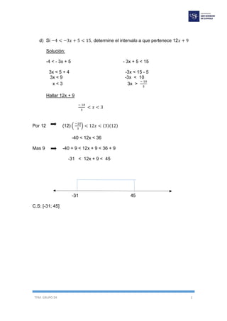 El documento presenta varios ejercicios de resolución de inecuaciones y funciones. En el primer ejercicio, se resuelven cuatro inecuaciones diferentes. En el segundo ejercicio, se relacionan cinco inecuaciones con sus correspondientes conjuntos solución. En el tercer ejercicio, se modelan inecuaciones para calcular cantidades y precios de venta.
