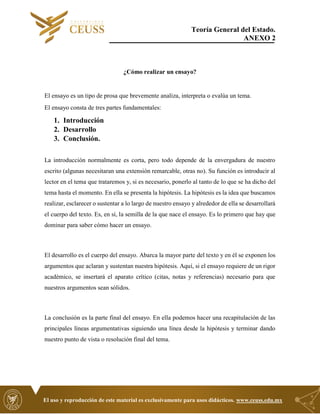 Este documento explica cómo realizar un ensayo. Un ensayo consta de tres partes: la introducción, el desarrollo y la conclusión. La introducción presenta la hipótesis o idea principal que se explorará. El desarrollo es el cuerpo del ensayo y donde se exponen los argumentos que sustentan la hipótesis. La conclusión recapitula los argumentos y da el punto de vista final sobre el tema.