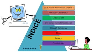 Este documento describe los marcadores sociales y las herramientas Diigo y Delicious. Explica que los marcadores sociales permiten a los usuarios etiquetar y compartir contenidos de interés, aunque también pueden causar confusión debido a sinónimos y la falta de una estructura jerárquica. Además, señala que estas herramientas pueden ser útiles en educación para que profesores y estudiantes compartan enlaces y recursos, aunque es posible que sean más adecuadas para profesores que para estudiantes de primar