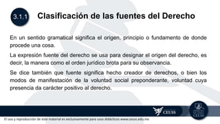 Este documento clasifica las fuentes del derecho en tres tipos: fuentes reales, que son los factores sociales, políticos y económicos que influyen en la formación de las leyes; fuentes formales, que son los procesos de creación de las normas jurídicas; y fuentes históricas, que son documentos antiguos que contienen leyes pasadas que sirven para entender y crear leyes actuales.