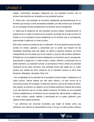El documento define el Estado como una sociedad humana establecida en un territorio, regida por un orden jurídico creado y sancionado por un poder soberano, con el fin de obtener el bien público temporal. A lo largo de la historia, han habido diferentes concepciones del Estado, pero las definiciones modernas enfatizan que es una institución con personalidad jurídica que une a la población a través de las leyes. La teoría del Estado busca estudiar esta organización de manera científica, crítica y prospectiva para lograr soc