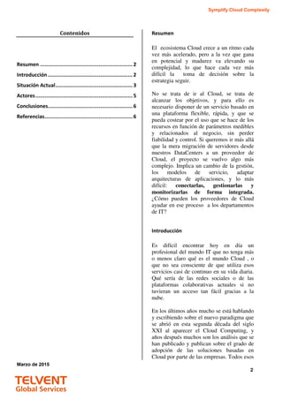El documento discute la creciente complejidad del ecosistema de la nube y cómo los proveedores de la nube pueden ayudar a los departamentos de TI a simplificarla. Explica que aunque la adopción de servicios en la nube ha crecido rápidamente, la migración de sistemas tradicionales ha sido más lenta. También describe los desafíos de conectar aplicaciones en la nube híbrida y la necesidad de transformar los departamentos de TI para que puedan administrar entornos más distribuidos.