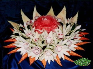 El arte de la talla de frutas y verduras se importó de China a Tailandia en el año 1364, donde se usaba para decorar platos y eventos hace más de 2000 años. Esta técnica involucra tallar frutas como manzanas, sandías y melones, así como verduras como nabos y zanahorias para crear arreglos florales elaborados.