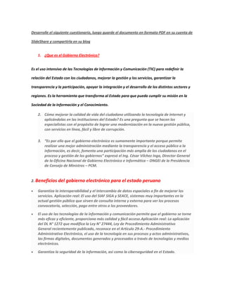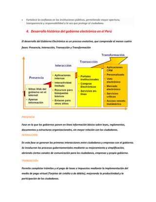 El documento presenta información sobre el gobierno electrónico en el Perú. Explica que el gobierno electrónico usa tecnologías de información y comunicación para mejorar la relación entre el estado y los ciudadanos, aumentar la transparencia y participación pública. También describe los beneficios del gobierno electrónico para el Perú como mejorar los servicios públicos y la eficiencia gubernamental a través de trámites en línea. Finalmente, resume los principales organismos del estado peruano involucrados en el gobierno electrónico como la