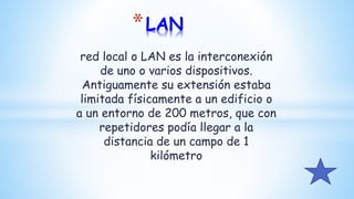 Este documento resume varios conceptos clave relacionados con las redes. Define una red local o LAN como la interconexión de dispositivos dentro de un edificio o un área de 200 metros. Explica que un router proporciona conectividad entre redes al enviar paquetes de datos de una red a otra. También describe el ancho de banda como la capacidad máxima de transferencia de datos en bits por segundo de un enlace de comunicación, y que los enlaces conectan diferentes tipos de información como imágenes, palabras e hipervínculos. Adem