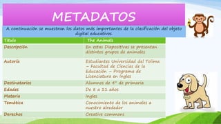 El documento presenta una presentación de PowerPoint sobre animales para estudiantes de 4to grado. La presentación incluye información sobre diferentes grupos de animales en inglés, sus hábitats, y características. El objetivo es ampliar el vocabulario de los estudiantes sobre animales y cómo clasificarlos. El docente utilizará la presentación de forma interactiva y los estudiantes participarán en discusiones y actividades de autoevaluación sobre los diferentes grupos de animales.