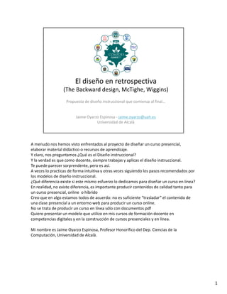 El diseño en retrospectiva es un enfoque instruccional que prioriza la identificación de resultados de aprendizaje antes de planificar contenidos y actividades. Este modelo, propuesto por McTighe y Wiggins, busca mejorar la calidad educativa tanto en cursos presenciales como en línea, enfatizando la necesidad de evaluaciones significativas y experiencias de aprendizaje activo. Además, sugiere un cambio en la forma de planificar clases, comenzando por cómo se evaluará el aprendizaje de los estudiantes.