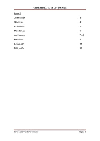 Este documento presenta una unidad didáctica sobre los colores. La unidad incluye una justificación, objetivos, contenidos, metodología, actividades, recursos y evaluación. Las actividades propuestas son un cuento motor, una canción, y una manualidad sobre los colores para desarrollar la creatividad de los niños y su conocimiento del entorno.