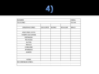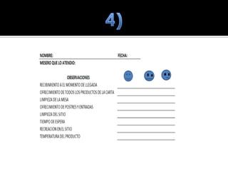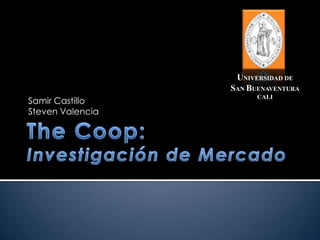 El documento presenta varias propuestas de dos vicepresidentes de The Coop para mejorar las ventas que han disminuido. Una propuesta incluye inspeccionar la calidad de los restaurantes de forma encubierta y compararlos con la competencia. La otra propone realizar grupos de enfoque, encuestas telefónicas y de imagen de marca, y estudiar la experiencia del cliente.